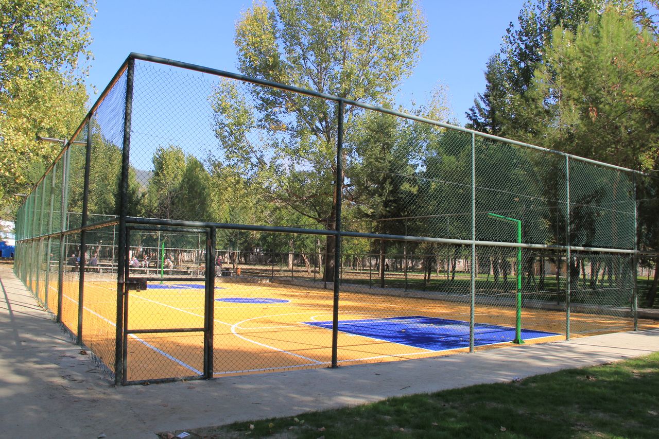 Basketball court in the park surrounded by trees