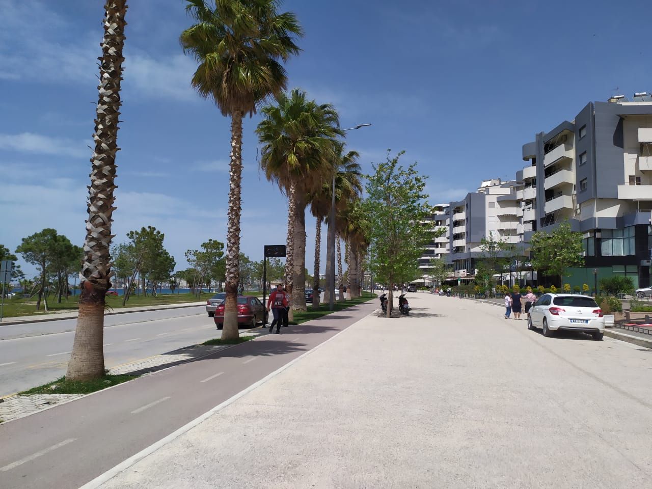 Road by the sea shore laid with rock and concrete. With tall palm trees on both sides.